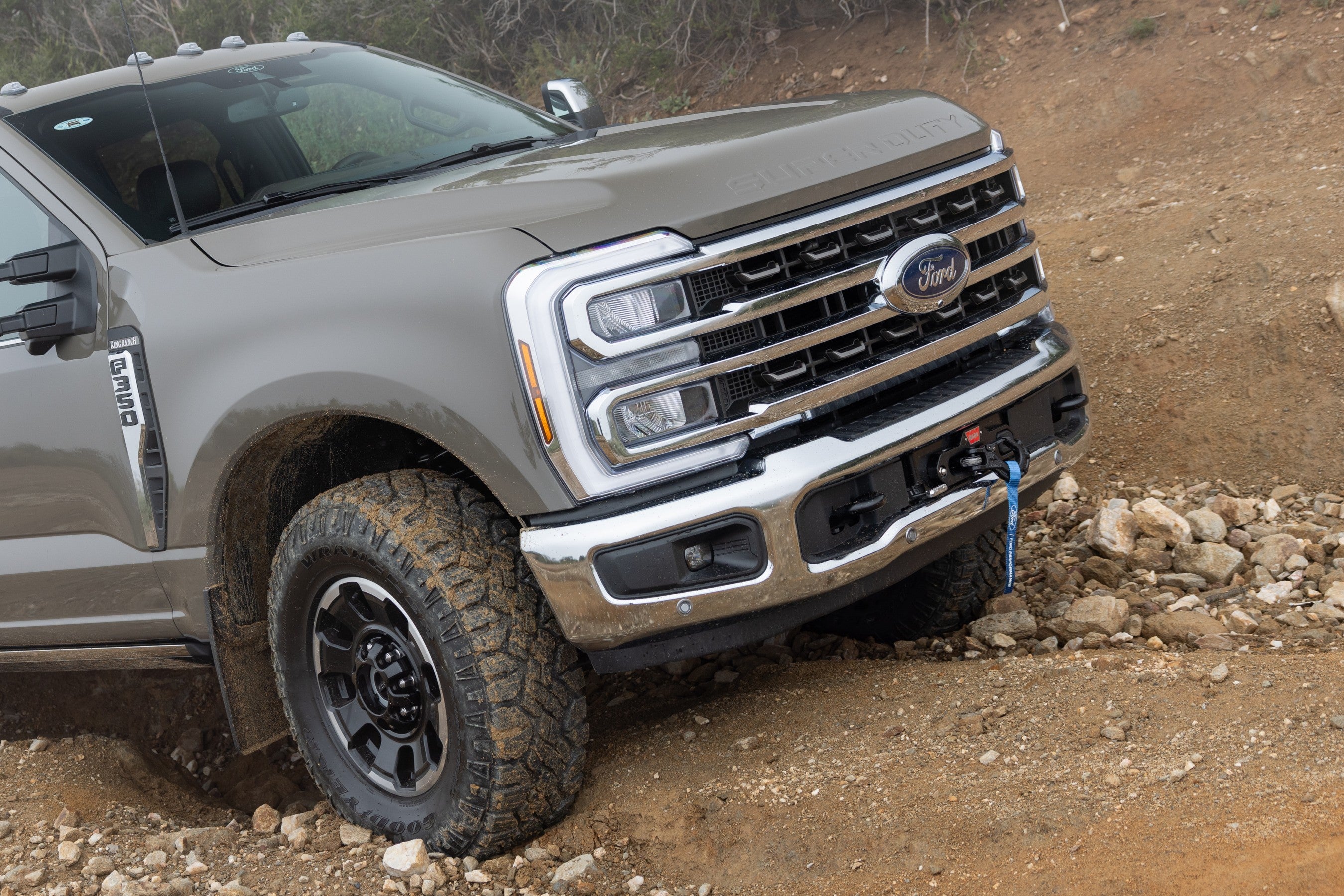 King Ranch-pakken lægger vægt på luksusliv i pickup-form, langt mere end dune-kørsel gennem ørkenen. Men Tremor-behandlingen introducerer også ganske legitime off-road-funktioner, herunder 35-tommer Goodyear Wrangler DuraTrac-dæk, et affjedringsløft og skid-plader, plus en 12.000-punds Warn-vinsch, som er indbygget i frontkofangeren. Så naturligt nok, midt i min daglige kørsel, begav jeg mig også ud på en hård sti, som jeg kender godt, for at teste, om en så kæmpe, udstyret lastbil kan følge med en robust, eventyrlysten livsstil.