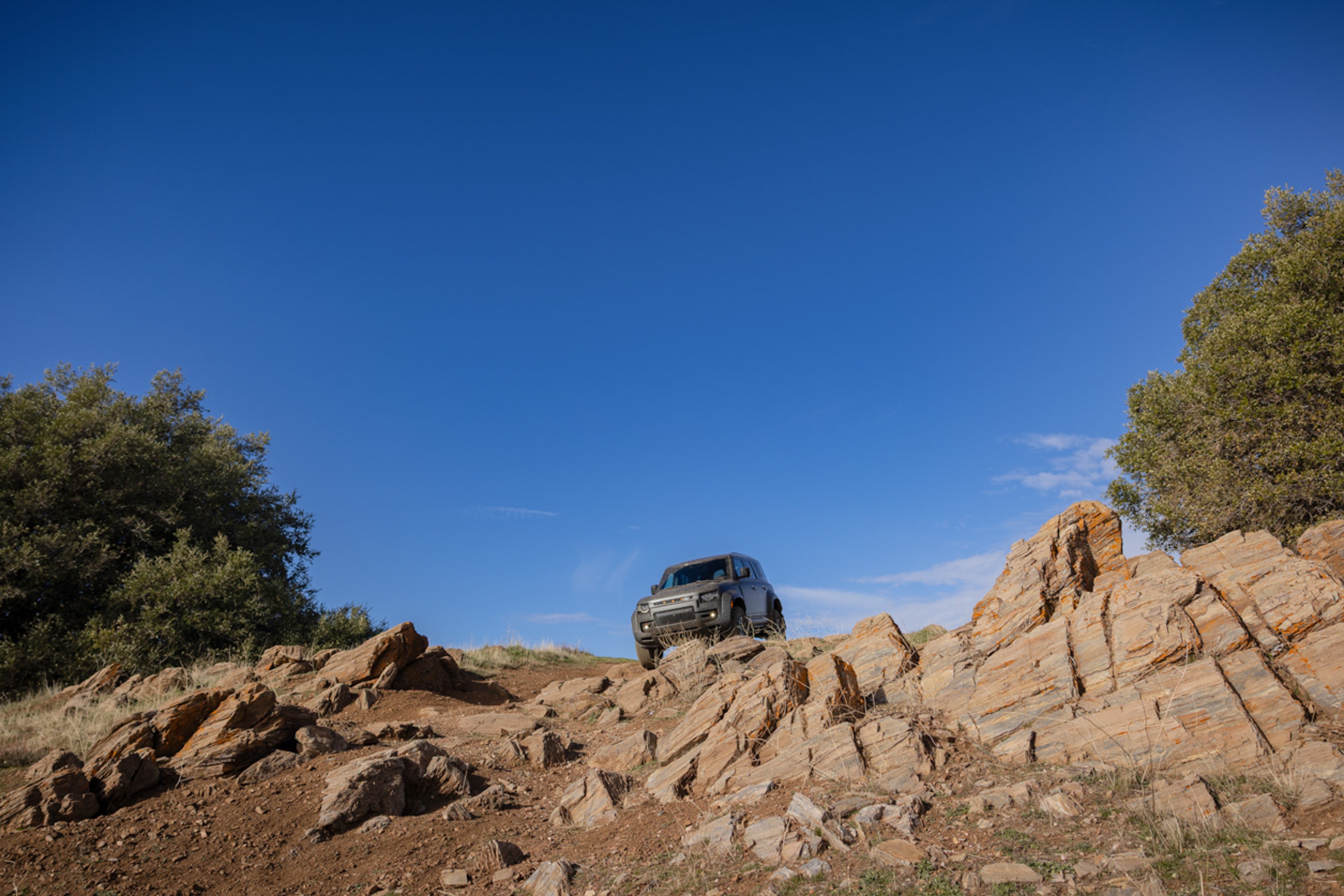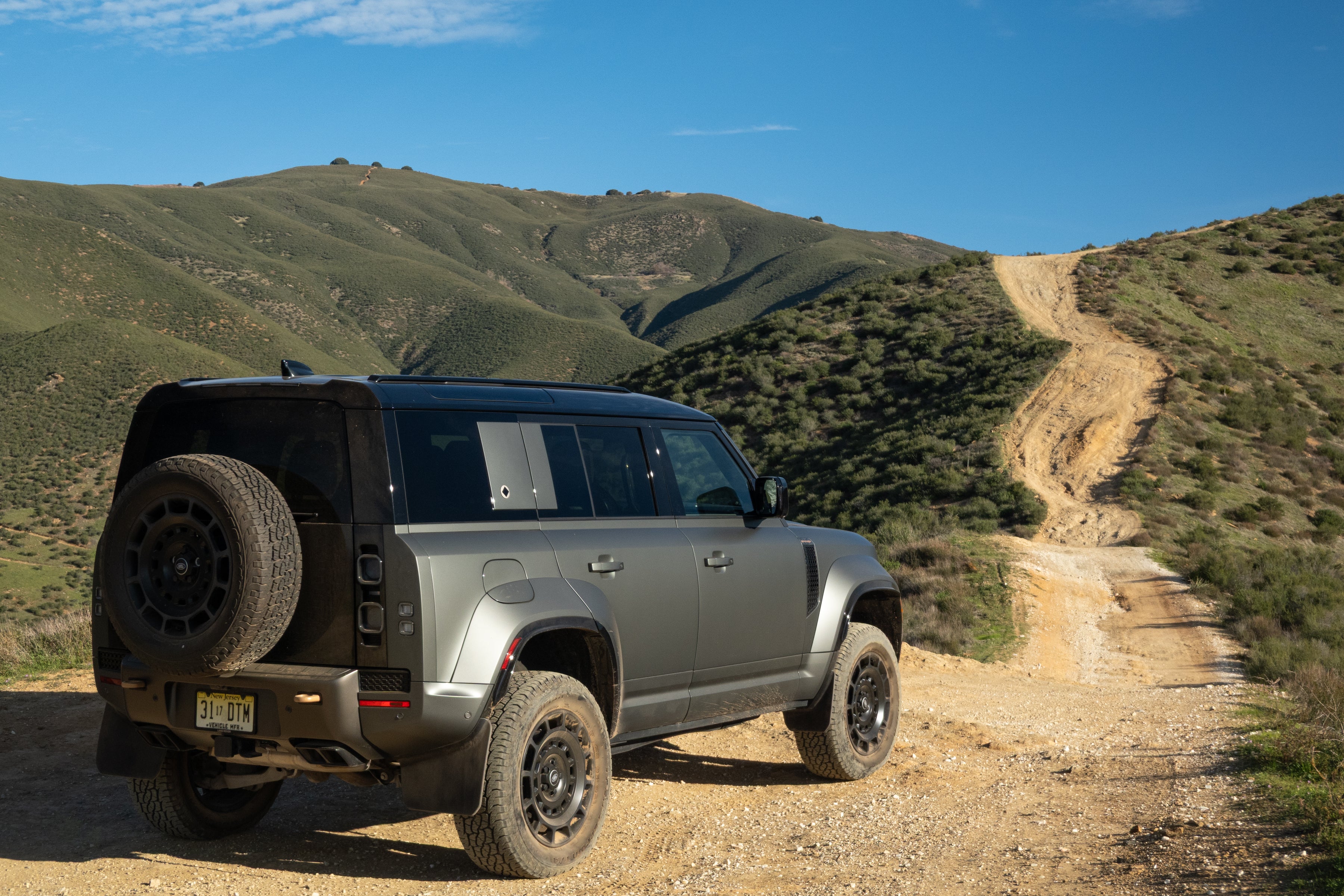 For at afprøve Octa’ens off-road troværdighed drog jeg ud til velkendte stier i ørkenen i det sydlige Californien for både højhastigheds kørsel og lavhastigheds klatre-/klippestrækning. I modsætning til Defender Classic har den nye generation skiftet til uafhængig affjedring hele vejen rundt, hvilket normalt betyder mindre bevægelighed og nedsat trækkraft, når stien bliver svær. Men Octa’ens model-specifikke hydrauliske rulreaktionssystem, som Land Rover kaldte “6D” fordi det styrer kropbevægelser i alle retninger ved at erstatte de stive svingstænger brugt på lavere trim, maksimerer tilgængelig hjulrejse så meget som muligt. Især når luftaffjedringen er pumpet op til den højeste kørehøjde, lagde jeg sjældent mærke til et dæk løfte sig fra jorden. Men retfærdigheden kræver, at når det skete, løftede kroppen sig så meget, at selv som seks fod én med lange ben, jeg ofte havde svært ved at stige ind og ud af førersædet.